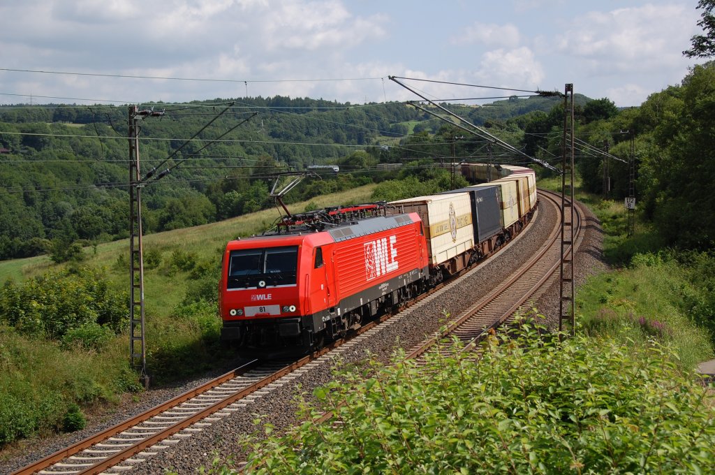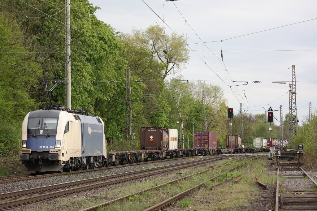 WLB ES 64 U2-060 am 27.4.12 mit einem KLV auf dem Weg nach Duisburg-Rheinhausen bei der Durchfahrt durch Ratingen-Lintorf.