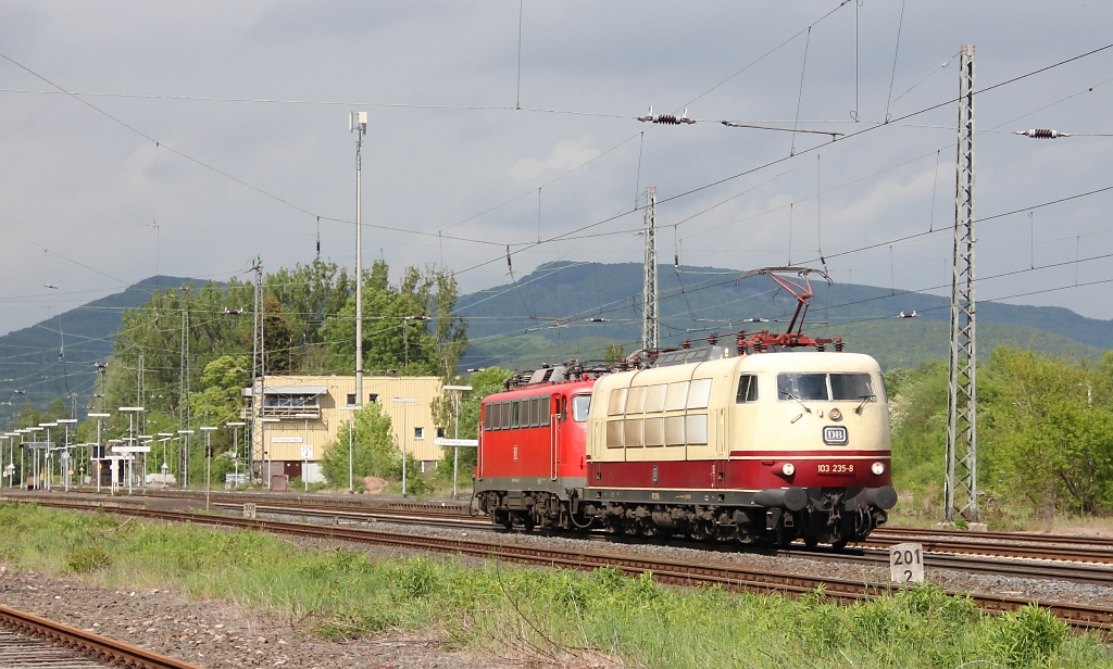 Zwei Bundesbahnklassiker auf einmal. Am 15.05.2012 überführte 103 235-8 die 110 468-6 von HBS nach FF und kam dabei über die NSS durch Eschwege West.