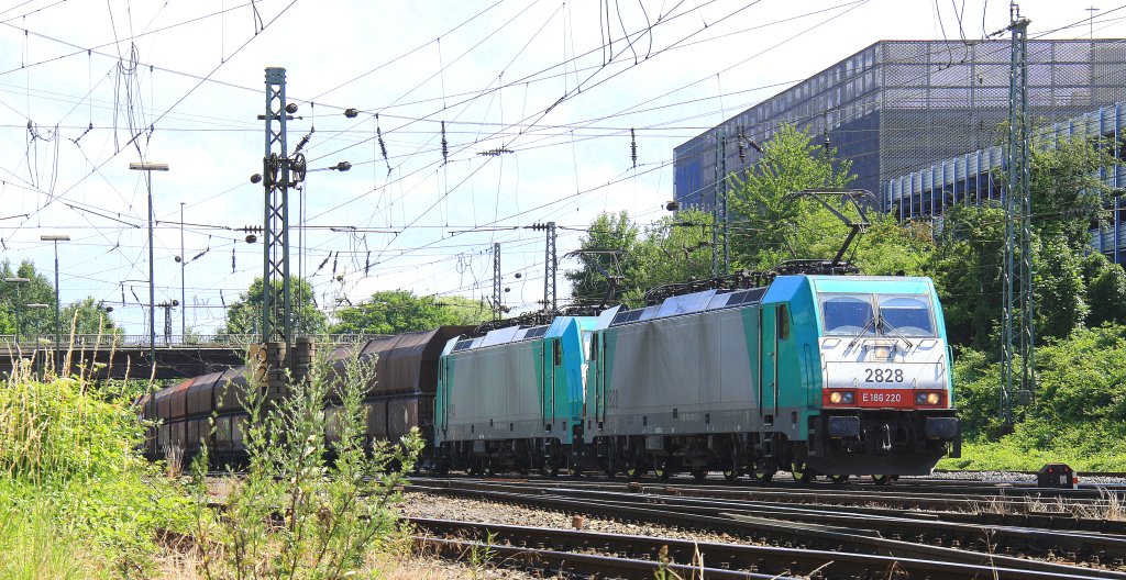Zwei Cobra 2828 und 2814 kommen mit einem Kalkzug aus Yves-Gomezée(B) nach Millingen und fahren in Aachen-West bei Sonnenschein mit Wolken am 1.7.2012.