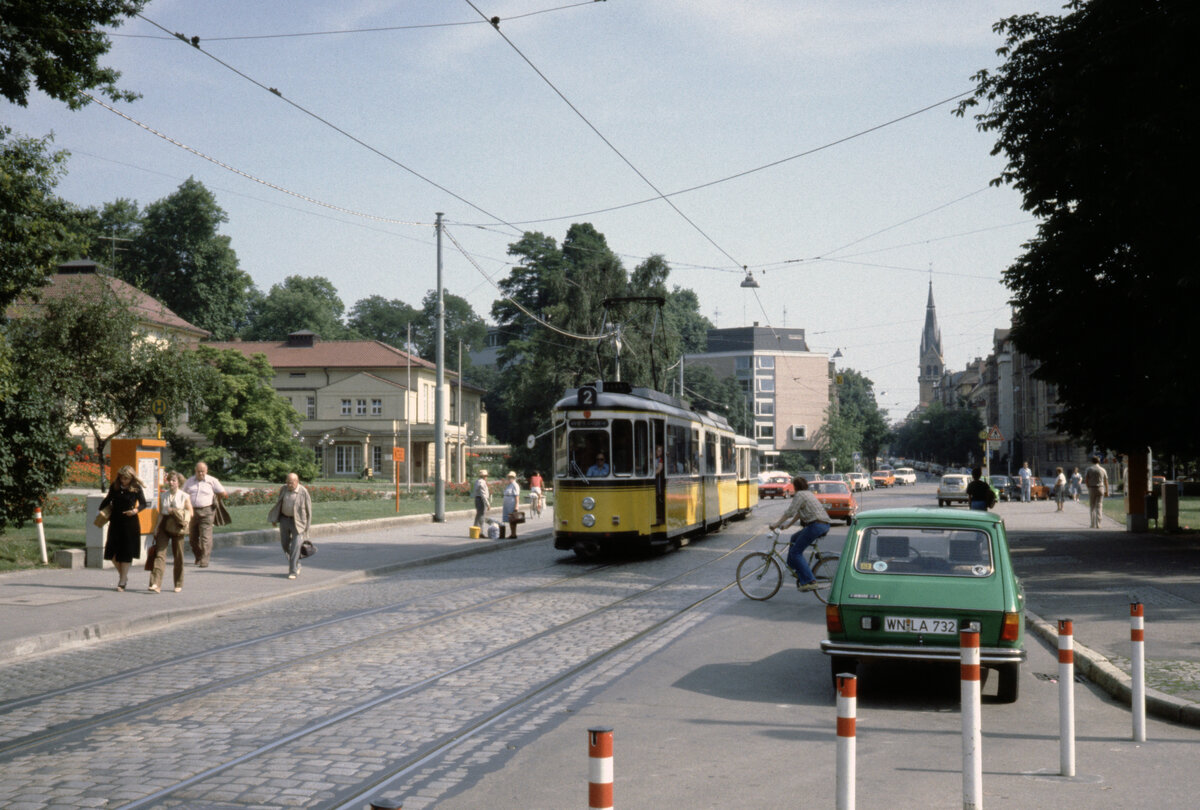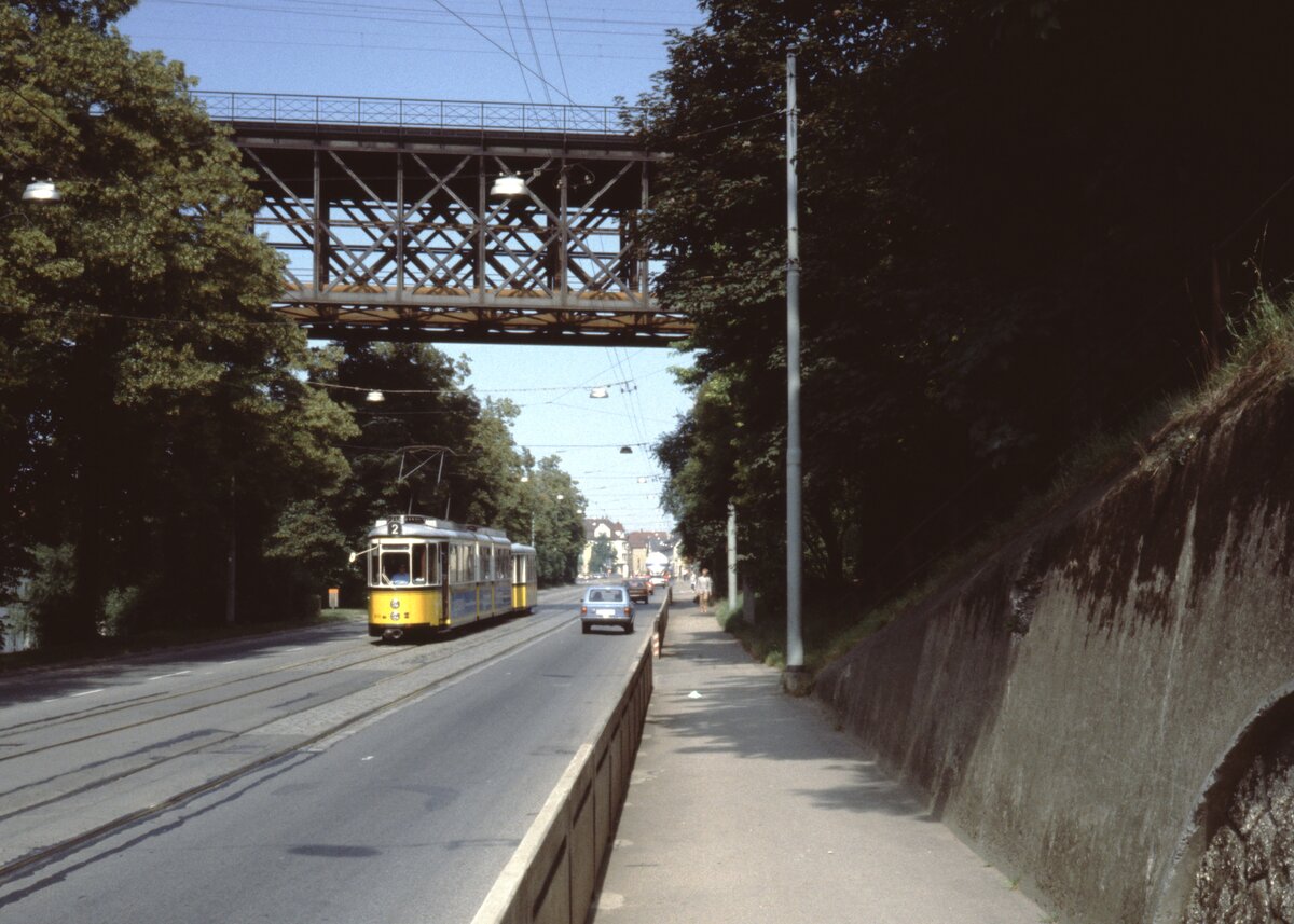 Stuttgart SSB SL 2 (DoT4) Bad Cannstatt, Königsplatz / Kurpark im Juli 1979. - Scan eines Diapositivs. Film: Kodak Ektachrome. Kamera: Leica CL.
