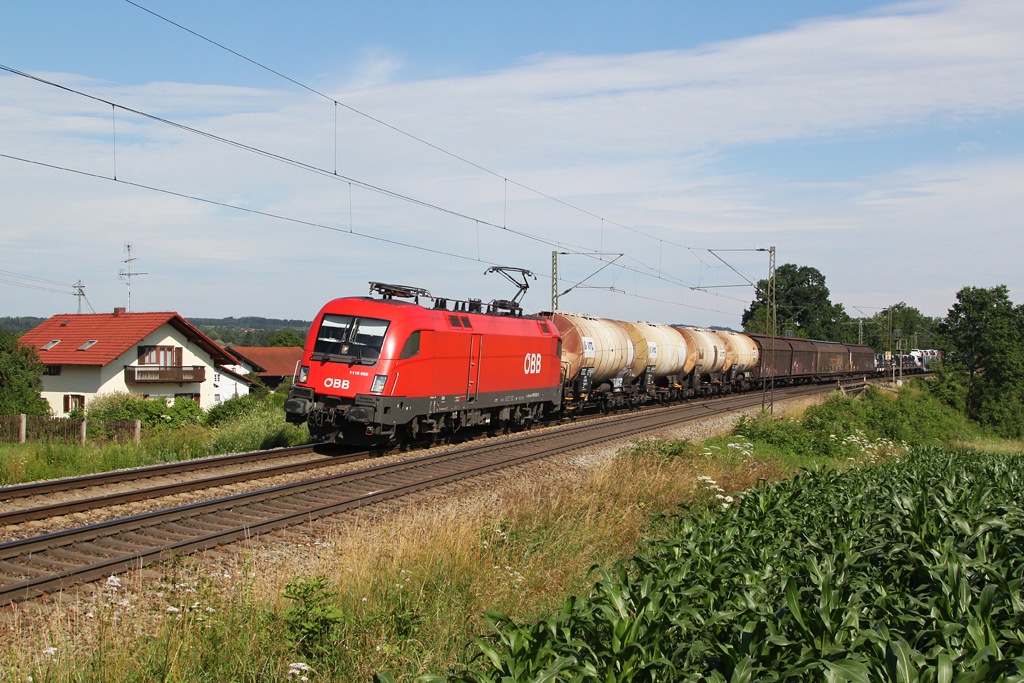 1116 050 mit einem gemischten Güterzug am 08.07.2012 bei Ostermünchen.