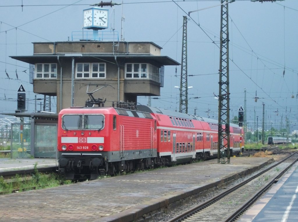 143 928 schiebt den RE 26022 nach Halle(Saale)Hbf am 08.Juli 2012 aus dem Leipziger Hbf Richtung Messe.