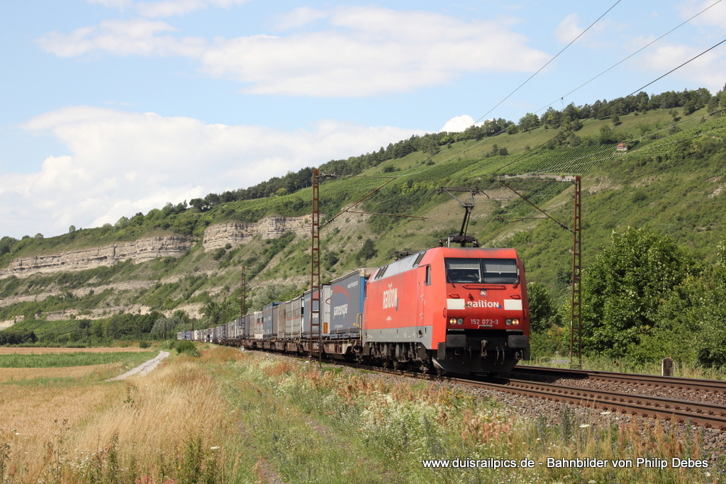 152 073-3 (Railion) fährt am 10. Juli 2012 um 15:46 Uhr mit einem Güterzug durch Thüngersheim