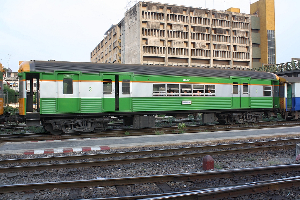บชส. 607 (บชส = BTC/Bogie Third Class Carriage) im neuen Design am 10.Mai 2012 im Bf. Hua Lamphong.