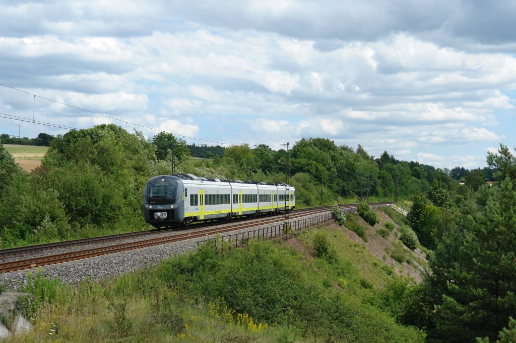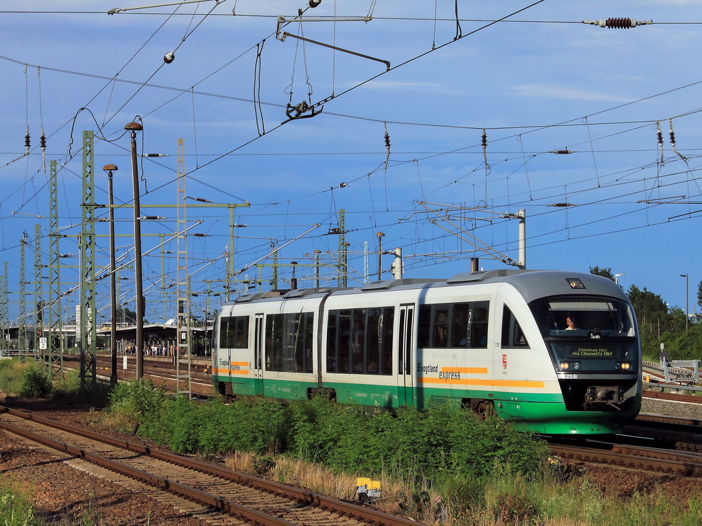 Der Vogtlandexpress (als VX81147) hier mit VT 23B am 08. Juli 2012 nach der Ausfahrt aus den Bahnhof Berlin Schönefeld Flughafen Richtung Zwickau, nächster Bahnhof ist Riesa in Sachsen.