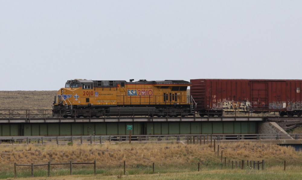 5.7.2012, 20km N von Laramie, WY / Route 30. Union Pacifics 2010 mit "BSA" Schriftzug - Boy Scouts of America:
