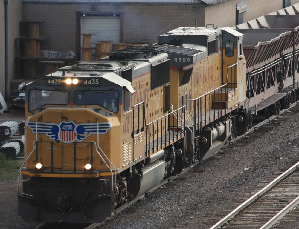 5.7.2012 Cheyenne, WY. Union Pacific 4435 (SD 70M) + 9509 (C41-8W) fertig zur Abfahrt westwärts mit leerem Schotterzug.