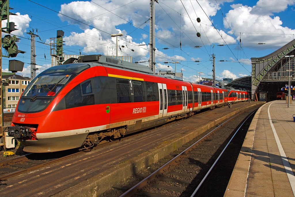 644 022/522 und ein weiterer 644er (2 gekuppelte 3-teilige Talent) als RE 22 (Eifel-Express) Köln – Euskirchen – Gerolstein - Trier, fährt am 07.07.2012 vom Hbf Köln los.