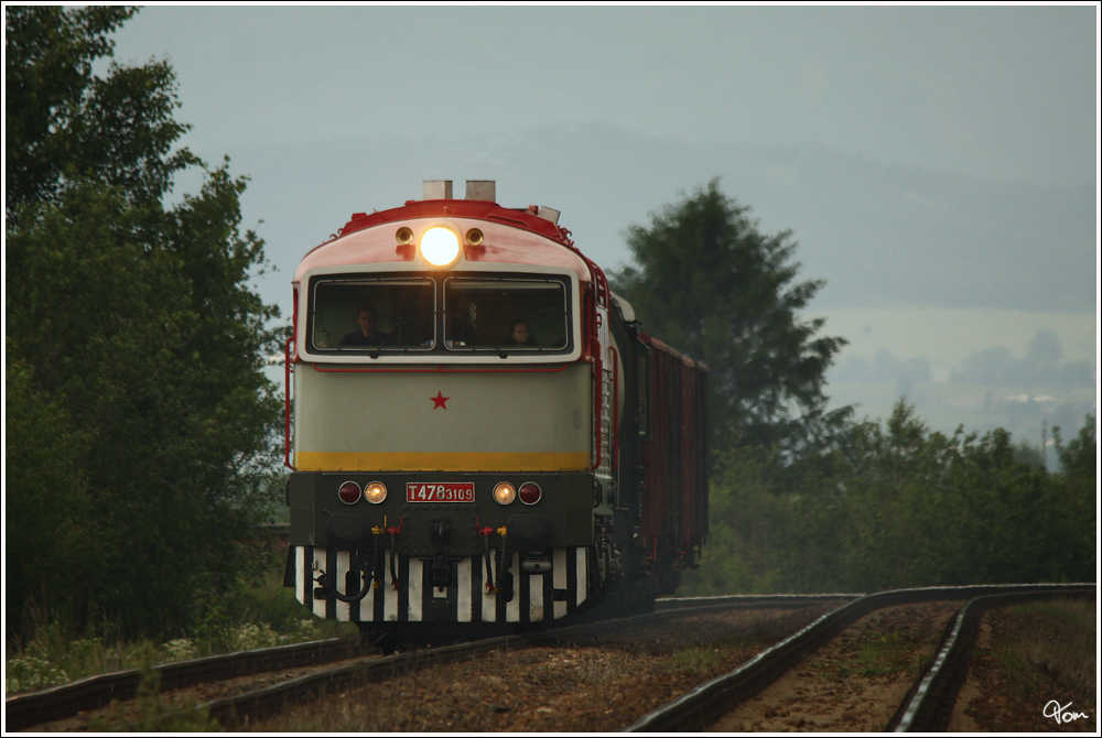 Als Brandbeobachtungszug fuhr am 2.6. 2012 die Diesellok T478.3109 (ZSSKC/Cargo Slovakia 753 109-8) von Vrútky nach Kremnica und retour, hier bei der Einfahrt in Horná Stubna.