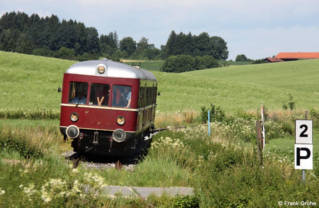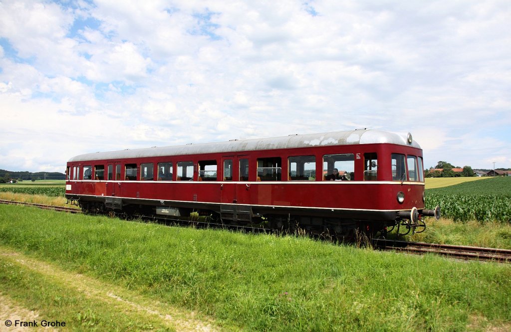 Chiemgauer Lokalbahn Esslinger VT 103 als P 82 Obing am See - Bad Endorf, KBS 12951 Lokalbahn Bad Endorf - Obing im See " LEO ", fotografiert bei Aindorf am 08.07.2012 --> Zuständiges Unternehmen für die Strecke ist die Rhein-Sieg-Eisenbahn GmbH.