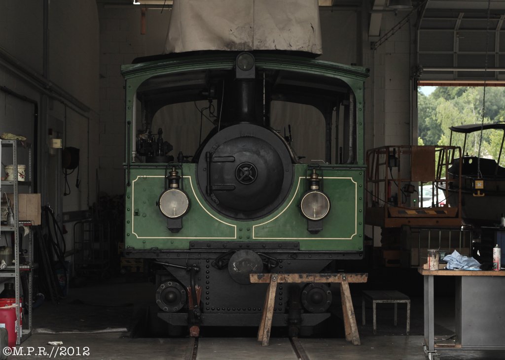 Das 125 Jahre alte Dampfross der Chiemseebahn konnte am 10.7.2012 im neuen Lokschuppen bei Stock( Prien ) gesichtet werden. Die Tramwaydampflok war wohl bemerkt beheizt. Jedoch traute sie sich aufgrund eines oder mehrerer Schäden nicht heraus. Laut dem Personal soll sie Freitag/Samstag wieder betriebsfähig werden! ( Der Fotostandpunkt war öffentlich zugänglich! )