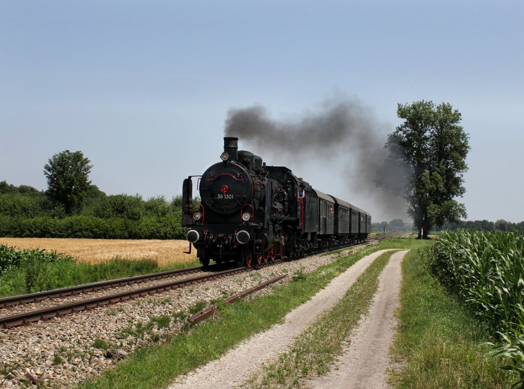Die 38 1301 mit einem Sonderzug nach Mühldorf am 30.06.2012 unterwegs bei Altötting.
