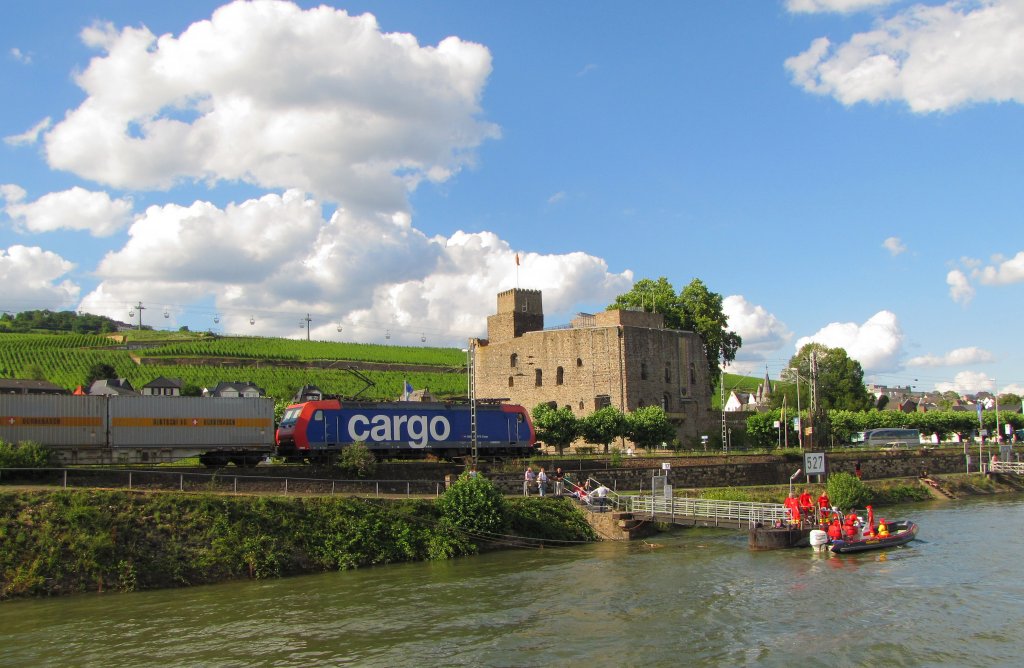 Die rechte Rheinstrecke führt in Rüdesheim zwischen Rhein und der B42 mitten durch den beliebten Touristenort. Im Hintergrund erkennt man die Brömserburg und die Seilbahn zum Niederwalddenkmal; 07.07.2012