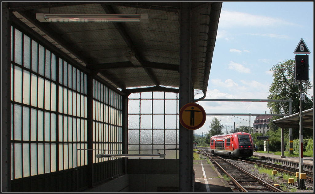Der Treppenabgang zur Bahnsteigunterführung in Waldshut wird durch diese schöne gläserene Einhausung geschützt.