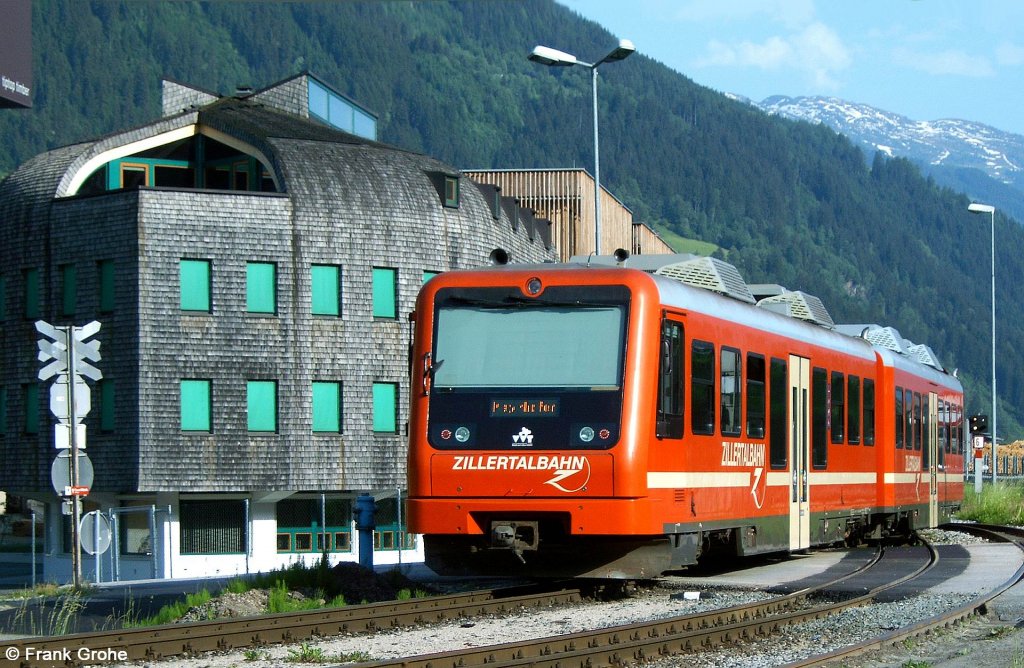 Moderne Wendezug-Garnitur der Zillertalbahn unterwegs im Planverkehr von Jenbach nach Mayrhofen, Schmalspurbahn 760 mm, fotografiert in Strass am 23.05.2009