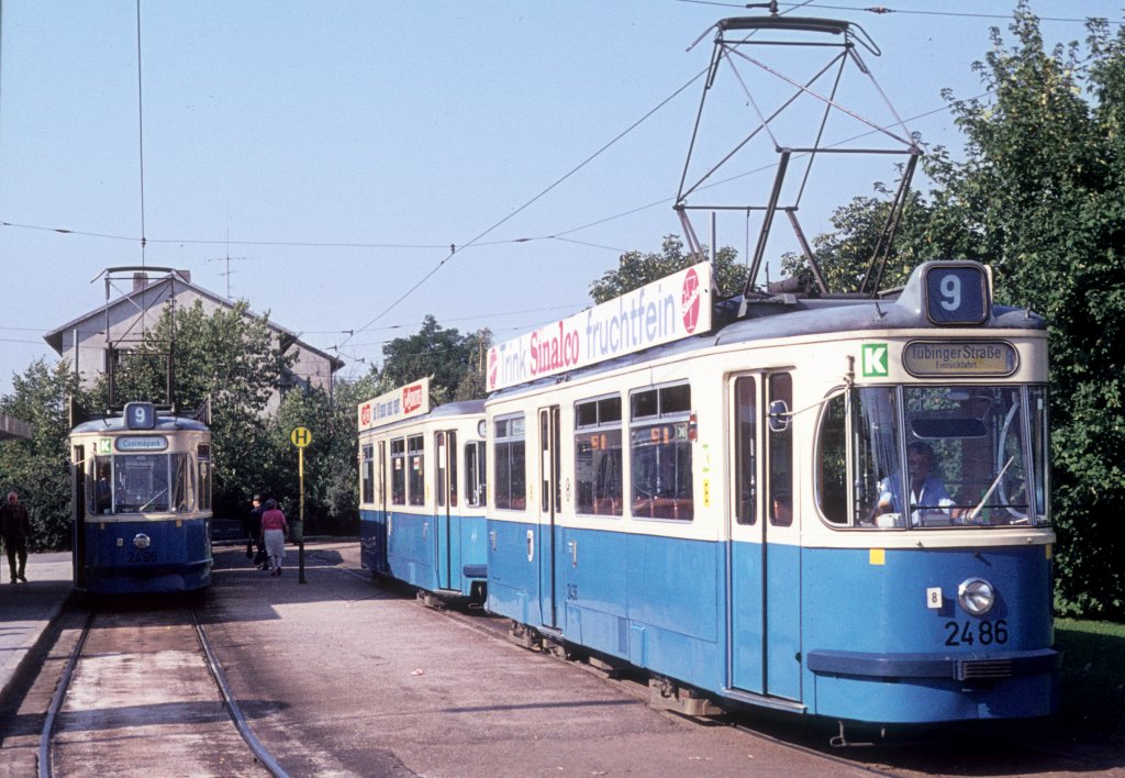 München MVV Tramlinie 9 (M4.65 2496 / M4.65 2486) Gondrellplatz am 17. August 1974. - Scan eines Diapositivs.