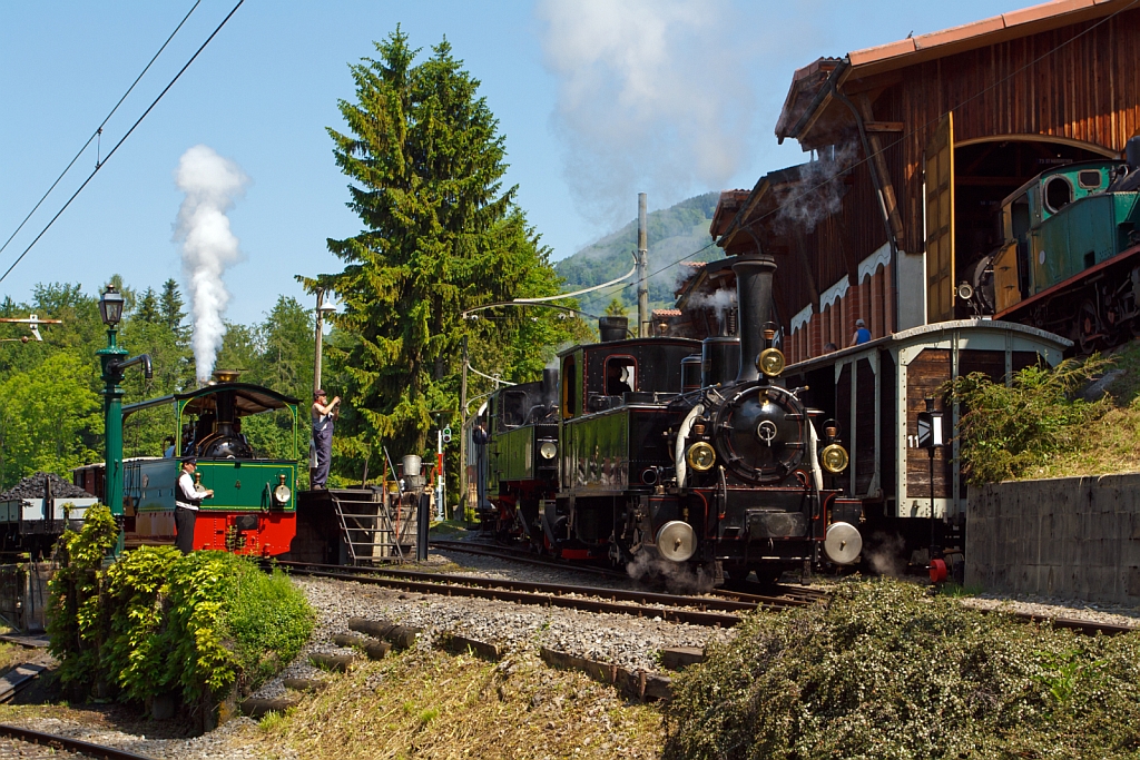 Links beim Wasserhahn steht die G 2/2 Krauss-Kastendampflok (Tramlok) Nr. 4, rechts schieben in doppeltraktion die G 3/3 Dampftenderlokomotive BAM Nr. 6 und die G 2x2/2 Malletdampflok 105 ihren Zug ins Museum Chaulin.