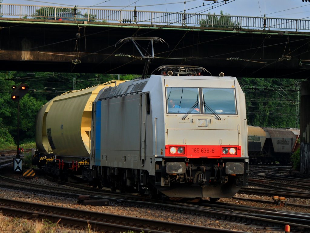 Railpool 185 636-8 zieht am 10.07.2012 einen Getreidezug aus Richtung Köln kommend durch das Gleisvorfeld von Aachen West.