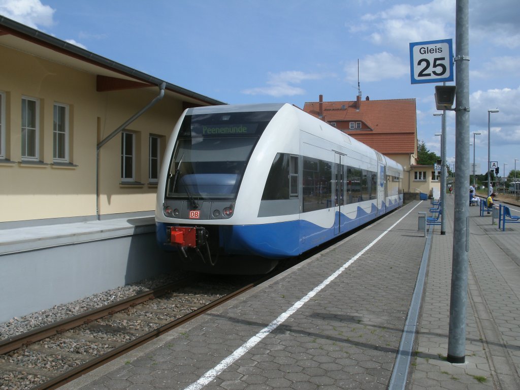 Soviele Gleise hat der Bahnhof Zinnowitz nicht,dennoch fuhr der 646 111 am 23.Juni 2012 von Gleis 25 nach Peenemünde ab.
