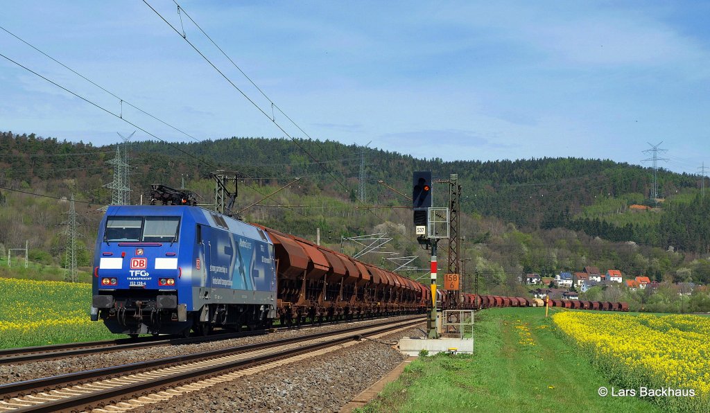 TFG 152 138-4 "ALBATROS" hat am 28.04.12 einen Schotterzug am Haken und bringt diesen Richtung Bad Hersfeld. Ludwigsaumühle.