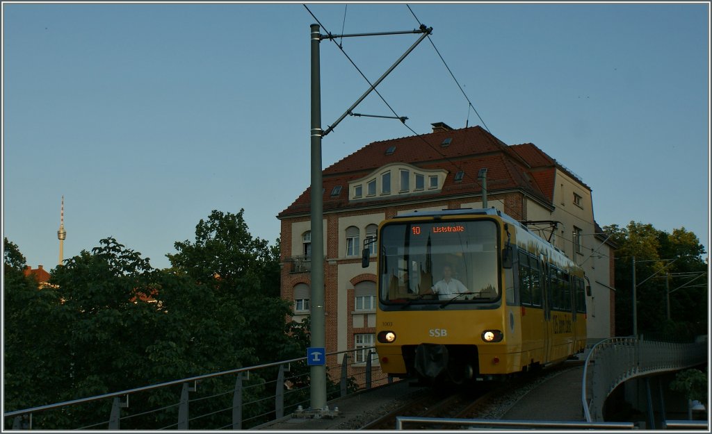 Trotz des langen Tages liegt der Marineplatz schon im Schatten, als die letzte "Zacke" von Degerloch" eintrifft, im Gegensatz zum Fernsehturm Hintergrund.