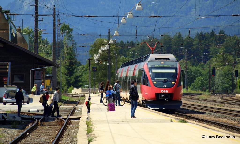 Während 4024 059-0 in den Bahnhof von Brixlegg einfährt, betreten die Fahrgäste nach kurzer Wartezeit den Bahnsteig. 26.07.11.