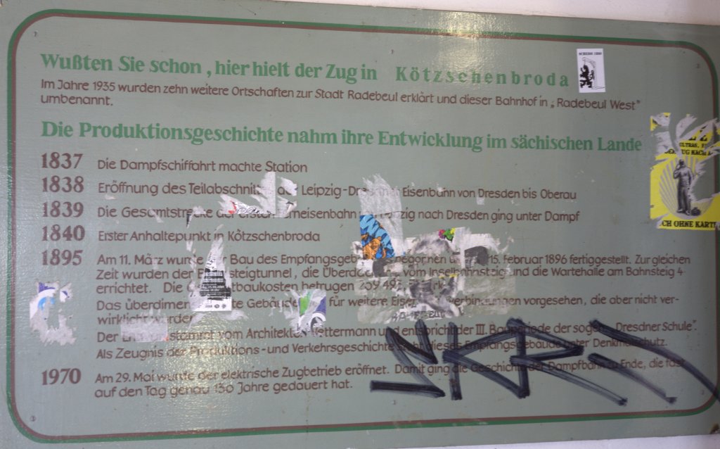 " Wußten Sie schon hier hielt der Zug in Kötzschenbroda .." Nach der malermäßigen Instandsetzung wurde diese Infotafel nach 1970 angebracht und informierte die Reisenden, heute ist sie hinter einer klemmenden , halboffenen Tür etwas versteckt und wird ihre Bedeutung verlieren, wenn das EG Radebeul West seinen Hausbahnsteig endgültig verloren haben wird. 17.07.12 17:29 Uhr