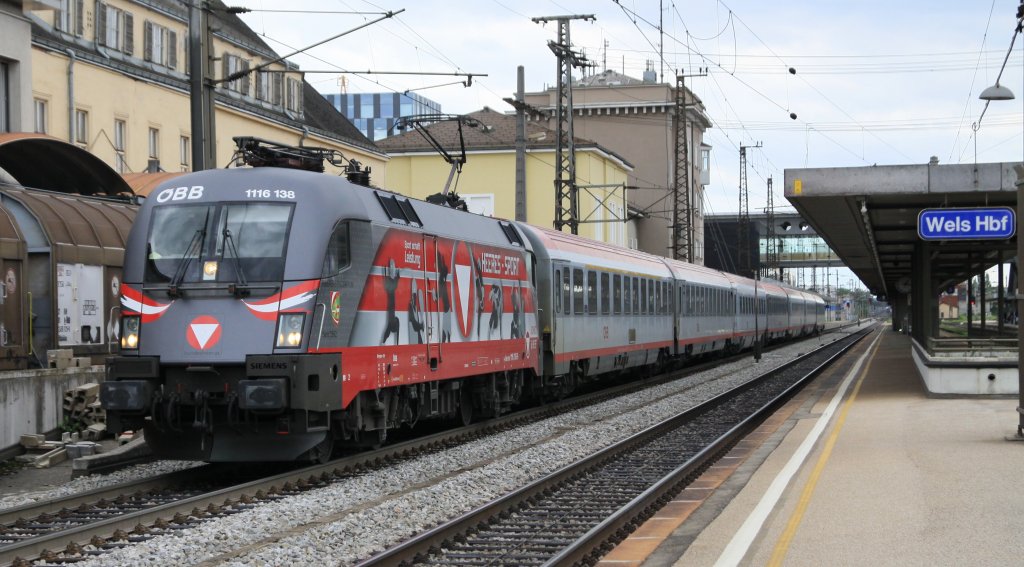 1116 138 (50 Jahre Heeressport) mit OIC 641 bei der Ausfahrt aus dem Bahnhof Wels. Aufgenommen am 17. Juli 2012.