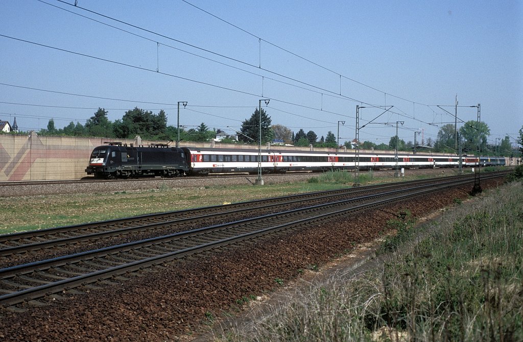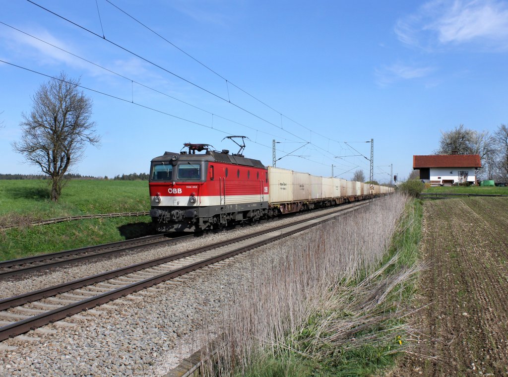 Die 1144 252 mit einem Containerzug am 19.04.2012 unterwegs bei Hilperting.