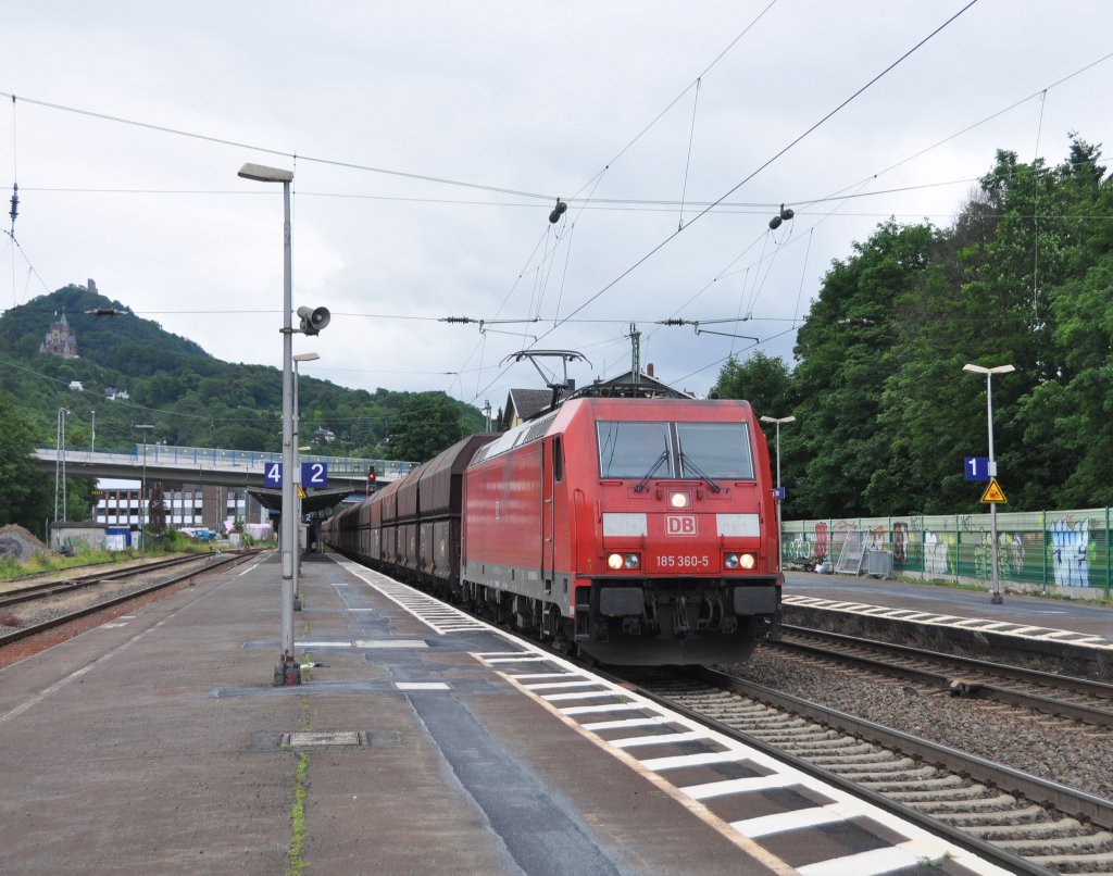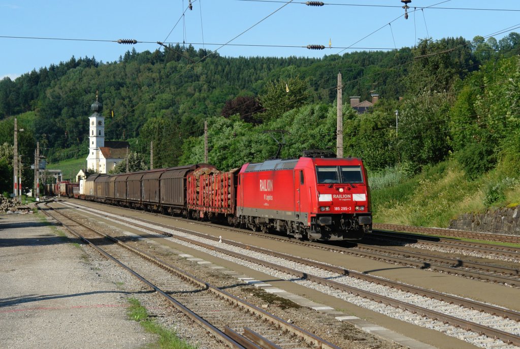 185 295 mit einem gemischten Güterzug am 14.07.2012 bei der Durchfahrt in Wernstein am Inn.