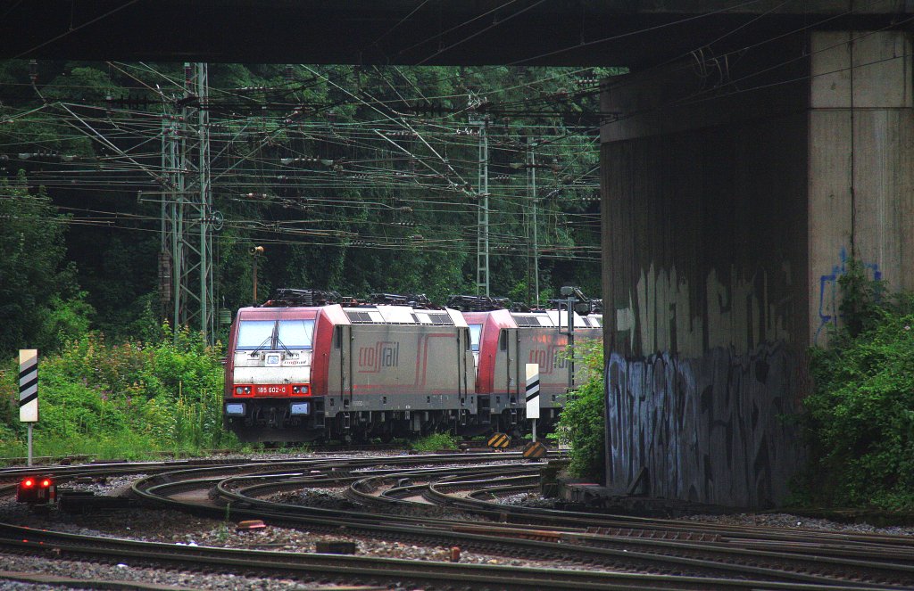 185 602-0 von Crossrail und noch eine andere 185er von Crossrail stehen in Aachen-West auf dem Abgestellgleis am Abend des 17.7.2012.