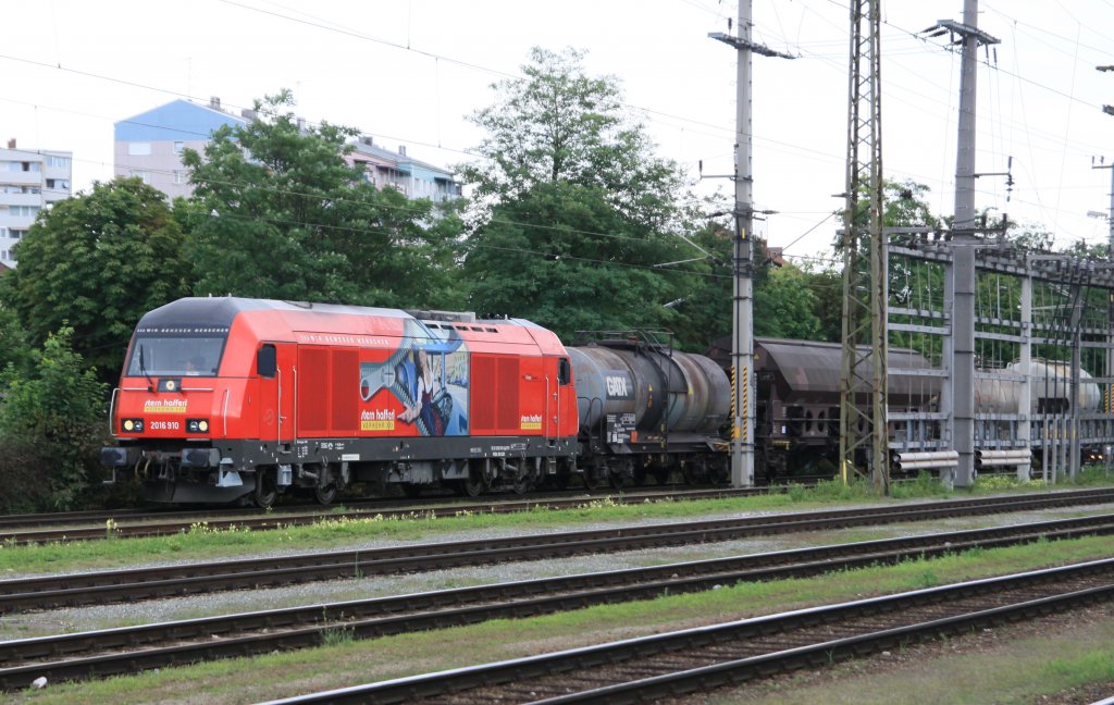 Am äussersten Bahnhofsgleis (Verbindungsgleis zur Zugförderung) fuhr heute die 2016 910 von Stern und Hafferl mit einem Verschubgüterzug in Wels durch. Aufgenommen am 17. Juli 2012.