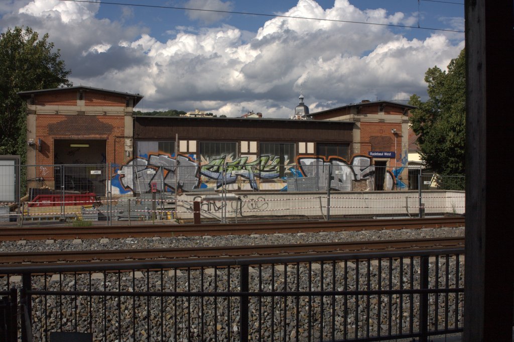 Blick vom Zugang zum Interims-S-Bahnsteig auf das Gebäude des Treppenaufganges zum ehemaligem Bahnsteig 4 des Bahnhofes Radebeul West. Die Tage des Gebäudes sind gezählt. 17.07.12 17:19 Uhr
