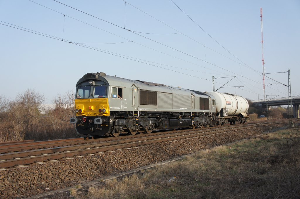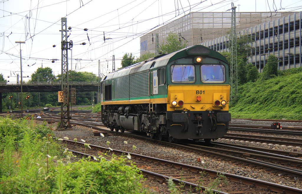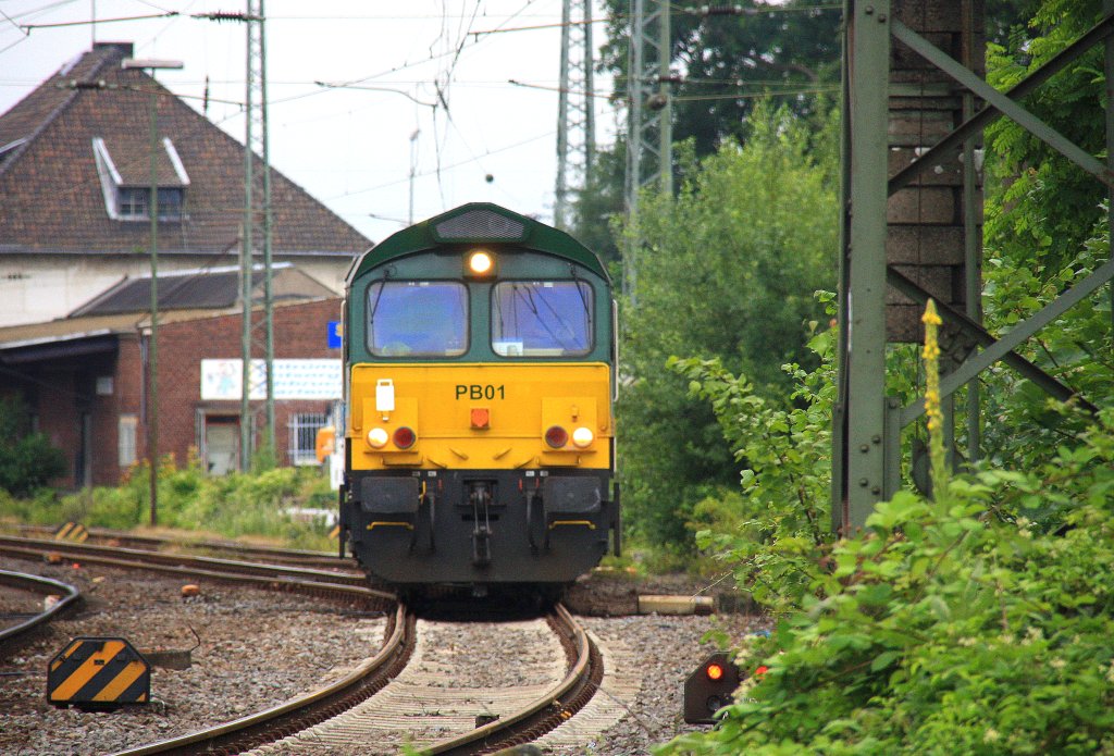 Die Class 66 PB01 und die V206 beide von der Rurtalbahn fahren als Lokzug von Aachen-West nach Montzen/Belgien bei Wolken am Abend des 17.7.2012.