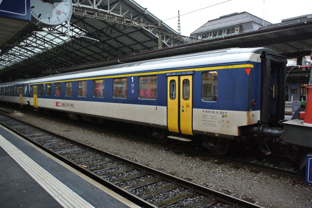 Der A NPZ EWI, 50 85 18-35 102-0, in Lausanne, 12.06.2012. Das spezielle an diesem Wagen ist, dass er trotz des Umbaus zu einem NPZ Wagen die urspüngliche Sitzanordnung behalten hat. D. h, dass er nur 48 Plätze, 3 Plätze pro Reihe, hat. Desshalb werden die Wagen auch A NPZ 48 genannt, wobei es eigentlich nicht mehr stimmt.. Denn dieser Wagen hat nur noch 46 Sitze, 2 wurden zwecks Rollstuhlplatz ausgebaut. Dennoch steht in der Wagenanschrift immer noch 48 Plätze. Der Grund dass dieser Wagen die alte Bestuhlung behalten hat ist simpel: 4 1. Kl. Wagen (100-104) wurden auf Wunsch des Kanton Tessins für die Linie Bellinzona-Locarno so belassen. Bei den übrigen Wagen haben nur noch 4er Abteile, d. h. 60 Plätze. Dies ist jedoch nicht so komfortabel für die 1. Kl., desshalb der Wunsch des Kanton Tessin. Nachdem die Wagen im Tessin durch neues Rollmaterial abgelöst wurden, wurde diese Kleinserie in den Westen versetzt, wo sie fortan ab dem Standort Lausanne einegsetzt wurden. Der Wagen im Bild wurde nur wenige Tage nach diesem Bild ausser Betrieb genommen. Heute ist nur noch Wagen 100 im Einsatz.