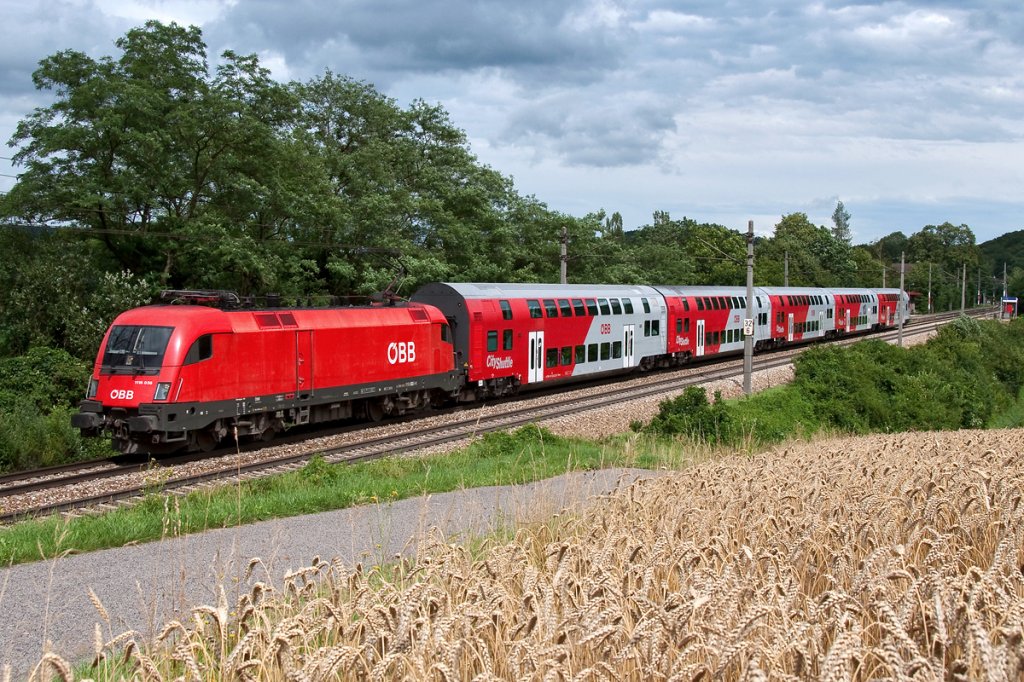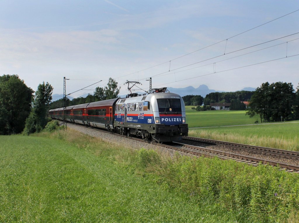 Die 1116 250 mit einem RJ am 23.06.2012 unterwegs bei Hilperting.