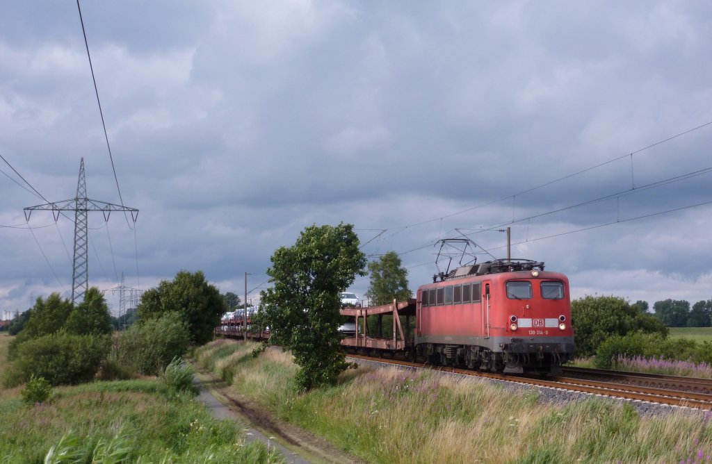 Die 139 314-9 fuhr am 17.07.2012 mit einem Güterzug von Emden nach Osnabrück, hier südlich von Leer.