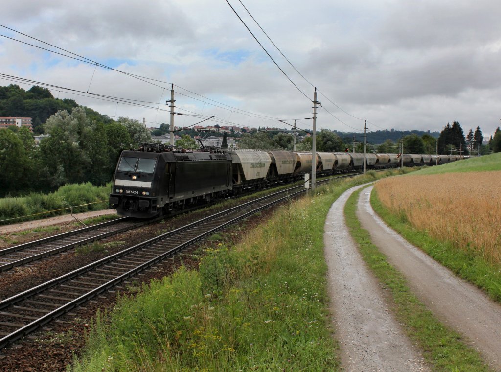 Die 185 572 mit einem Getreidezug am 14.07.2012 unterwegs bei Ingling.