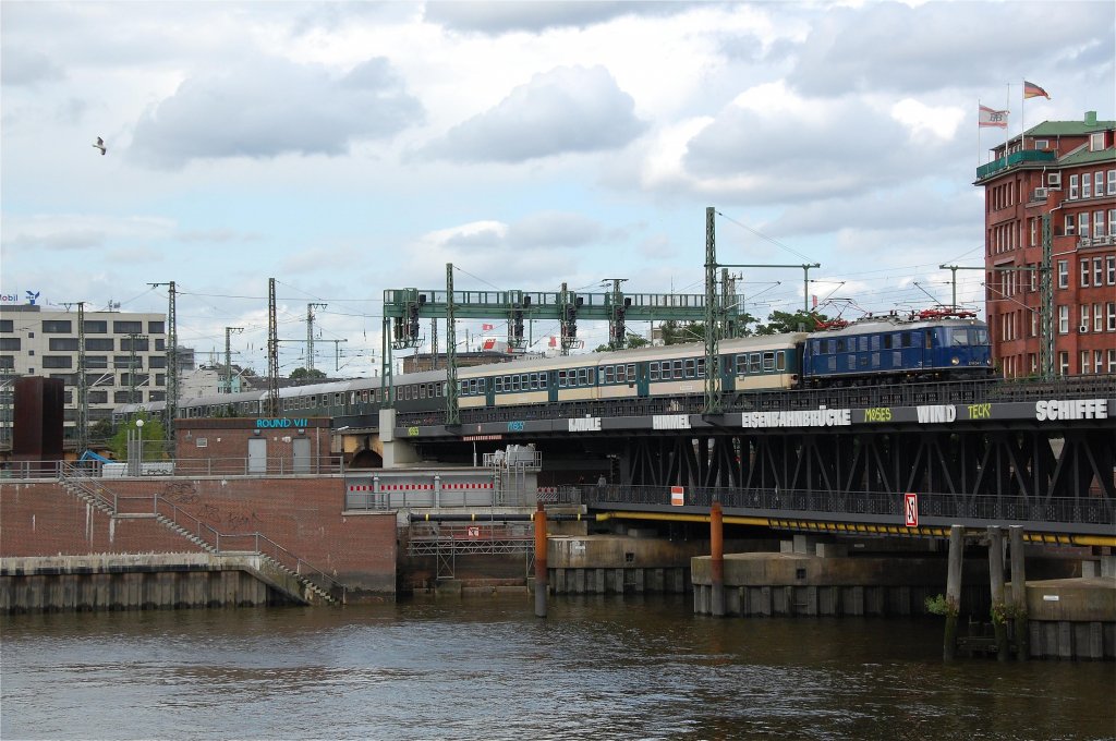E 18 047 überquert am 15.07.2012 mit ihrem Sonderzug von Hamburg Hbf nach Treysa (DPE 5939) die Oberhafenbrücke in Hamburg.