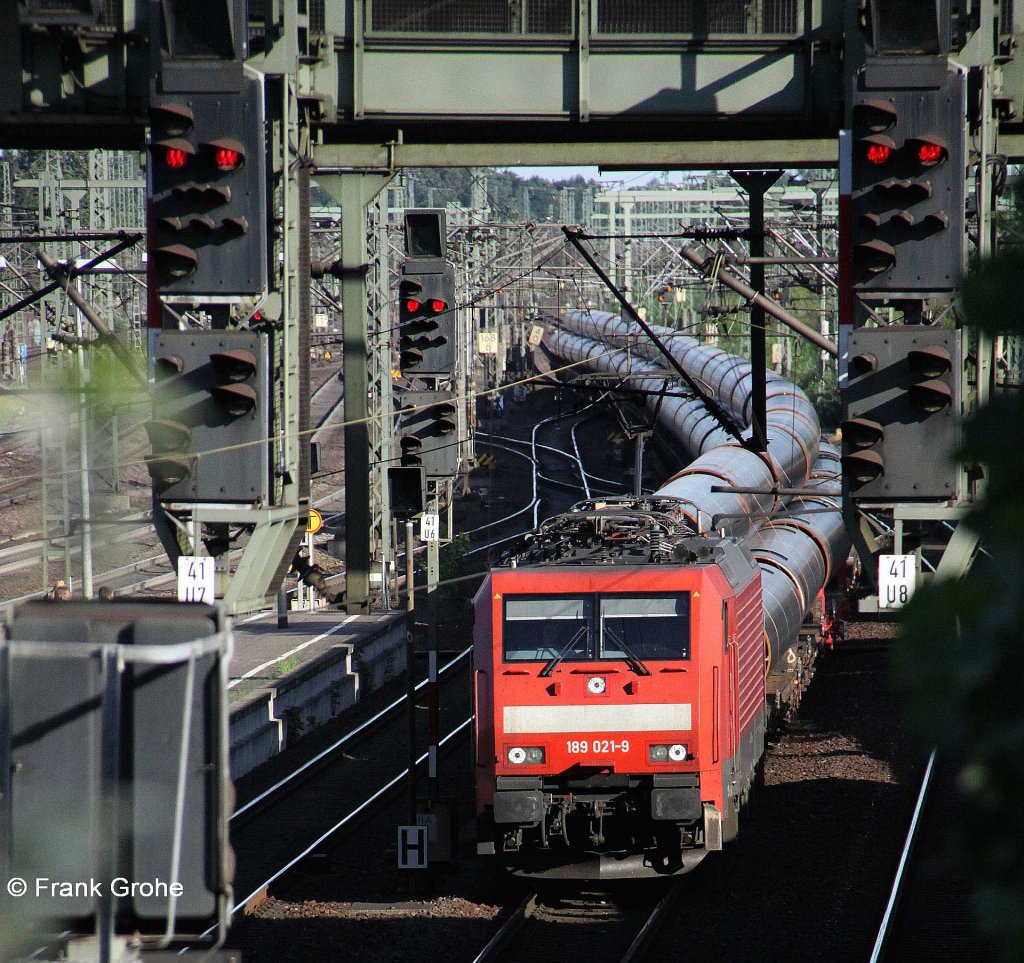 im " Signalwald ", DB 189 021-9 vor Ganzzug Flachwagen mit Rohren Richtung Hamburg, fotografiert bei der Durchfahrt Bhf. Harburg am 02.08.2011