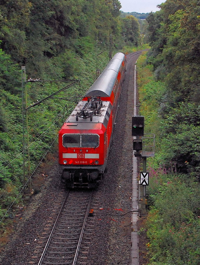 Im Einschnitt am Gotzweg in Rheydt Mülfort schiebt am Abend des 16.7.2012 die 143 018-0 einen RB 27 Zug in Richtung Odenkirchen.