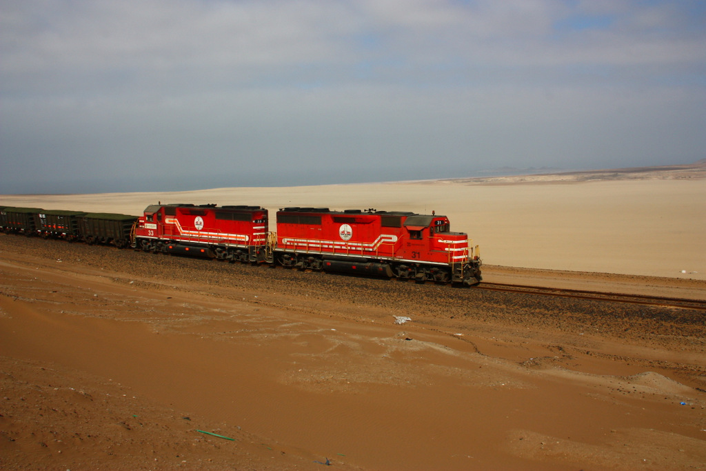 SPCC 31 und 33 ( EMD GP40-2 ) führen einen mit Kupfererz beladenen Zug talwärts Richtung Hafen ILO. 29.8.2011 Im Hintergrund die Pazifikküste.
