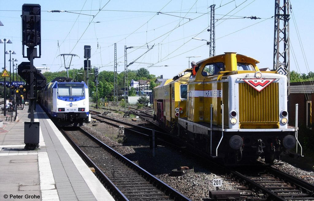 Wiebe Lok Nr. 2, 211 341-3, rangiert mit Bauzug. Am Bahnsteig steht Metronom ME 146-06 vor abfahrbereitem ME 82118 Uelzen - Hamburg Hbf., KBS 110 Hannover - Hamburg, fotografiert im Bhf. Uelzen am 06.05.2011 --> Zur V 100: ex DB 211 341, heute H.F. Wiebe GmbH & Co.KG, Die Lok wurde 1962 von der Firma Jung mit der Fabriknummer 13468 gebaut.