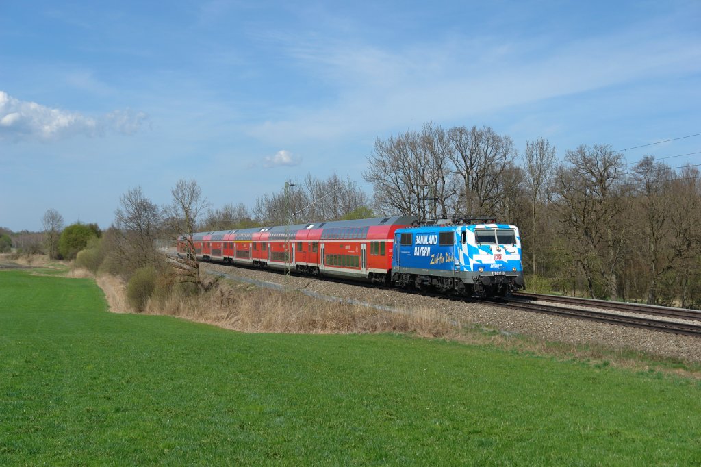111 017 mit einem RE nach Salzburg am 03.04.2011 unterwegs bei Hilperting.