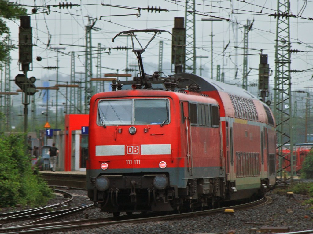 111 111 schiebt am 16.07.2012 den RE4 durch den Nieselregen in Aachen West.