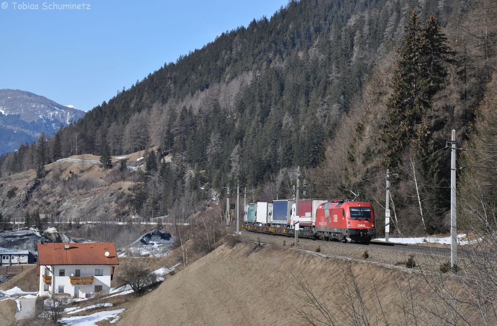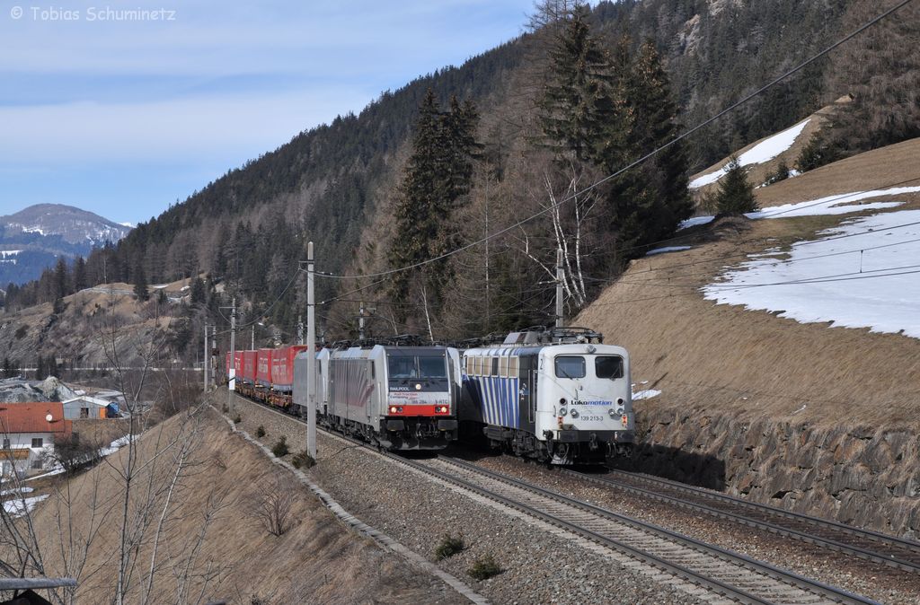 186 248 zieht mit einer Schwestermaschine einen KLV-Zug am 10.03.2012 bei Wolfdie Brenner Nordrampe hinauf, während 139 213 am Ende eines abwärts fahrenden Lokzuges hängt.