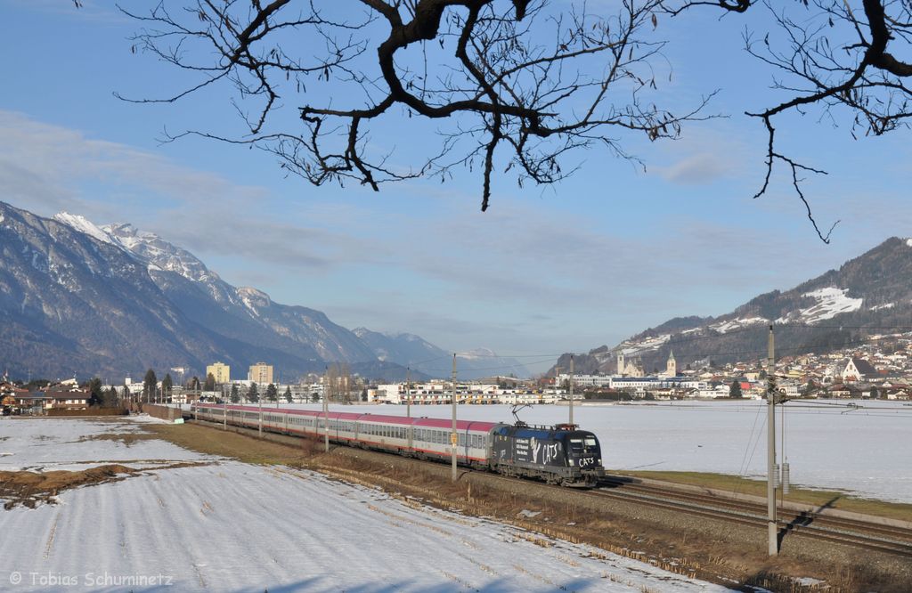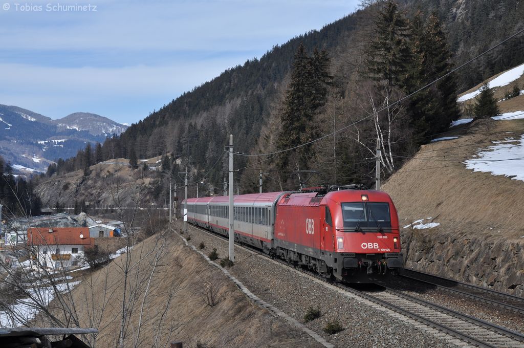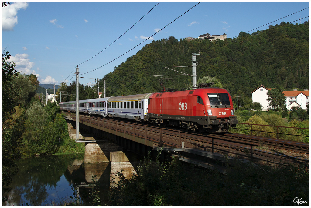 An der Burg Oberkapfenberg vorbei, fährt 1116 074 mit EC 103 "Polonia" (Warschau - Villach)