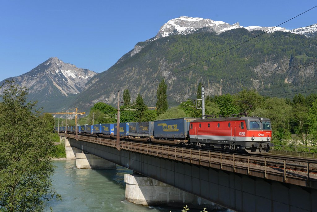 1144 024 schiebt einen LKW-Walter-KLV zum Brenner bei der Überquerung des Inns in Brixlegg am 19.05.2012.