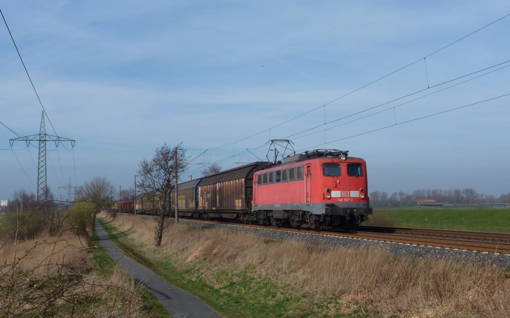140 537-2 fuhr am 27.03.2012 mit einem Güterzug von Emden nach Osnabrück, hier südlich von Leer.