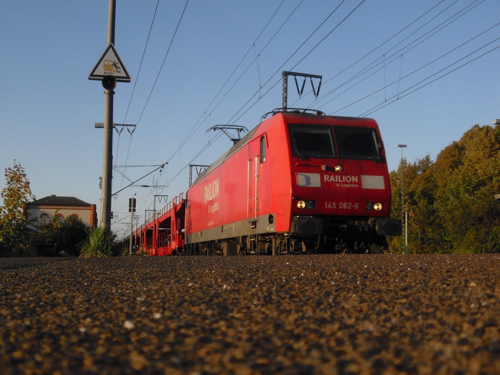 145 062-6 fuhr im Oktober 2011 mit einem Güterzug durch den Bahnhof Leer gen Süden.